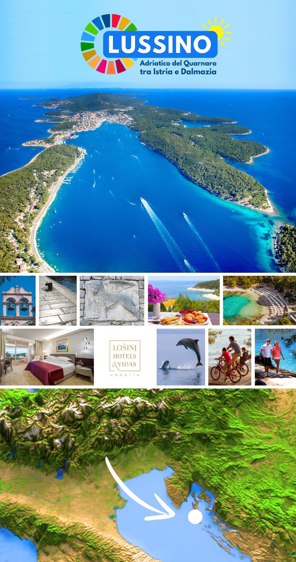 A Lussino ci sono decine di spiagge. Ospitalità di qualità, affidabile e a buon prezzo con “Losinj Hotels & Villas” che offre svariate possibilità di alloggio per single e coppie, famiglie e gruppi. Escursioni nell’arcipelago di isolette del Quarnaro tra l’Istria e la Dalmazia. Ottima gastronomia, prodotti locali eccellenti. Tanti impianti sportivi, piscine, tennis e sport in libertà a piedi, in bici e in acqua. Musei, sale congressi e conferenze, aeroporto e traghetti.