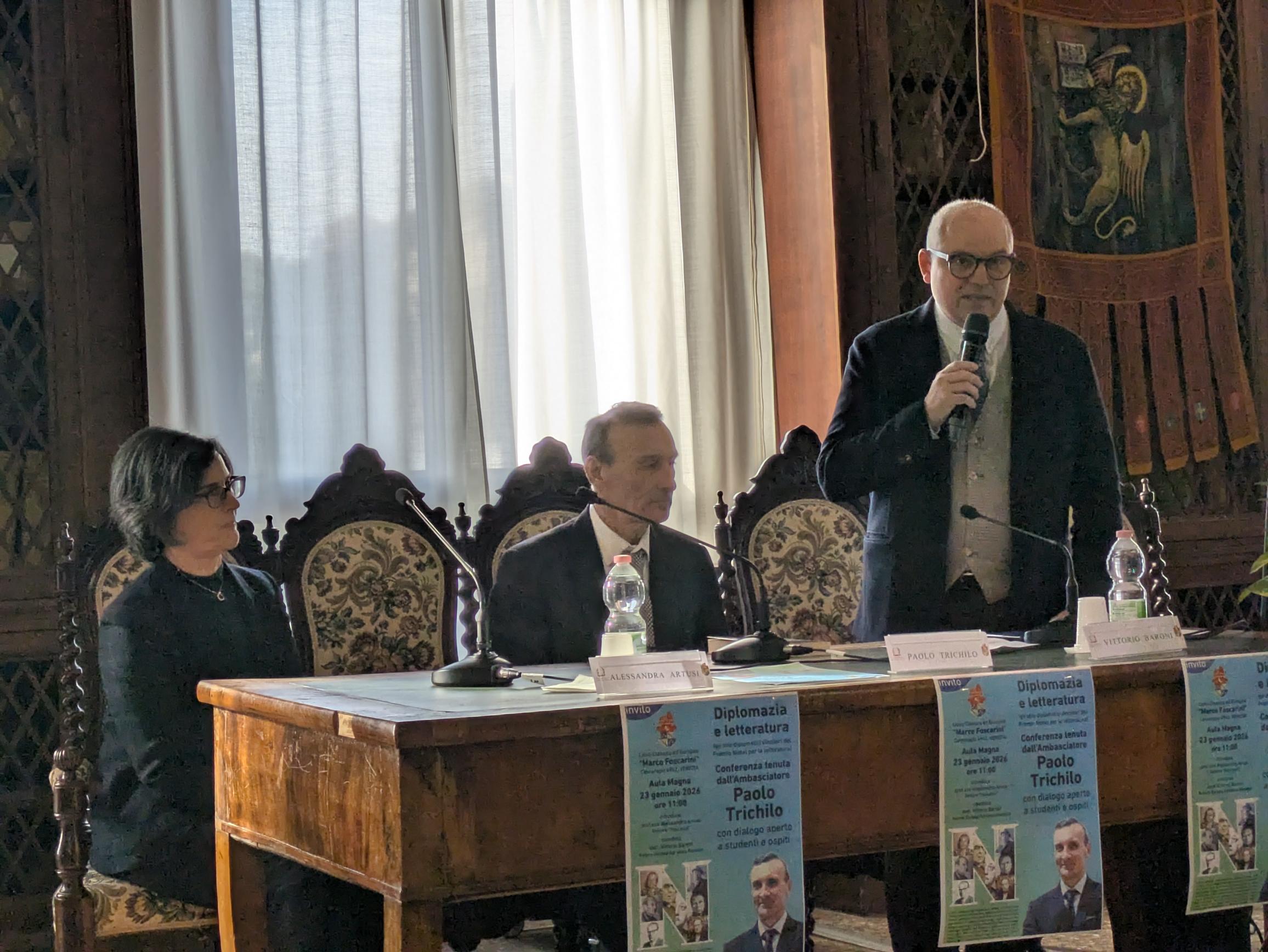 “Diplomazia e letteratura non sono termini contraddittori al contrario – ha detto Trichilo – possono convivere e rafforzarsi reciprocamente, come dimostra il fatto che ben otto diplomatici di alto livello siano stati insigniti del Premio Nobel per la Letteratura. La parola scritta, come l’azione diplomatica, nasce dall’ascolto, dall’osservazione e dalla capacità di interpretare il mondo”.
