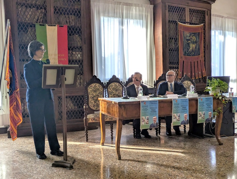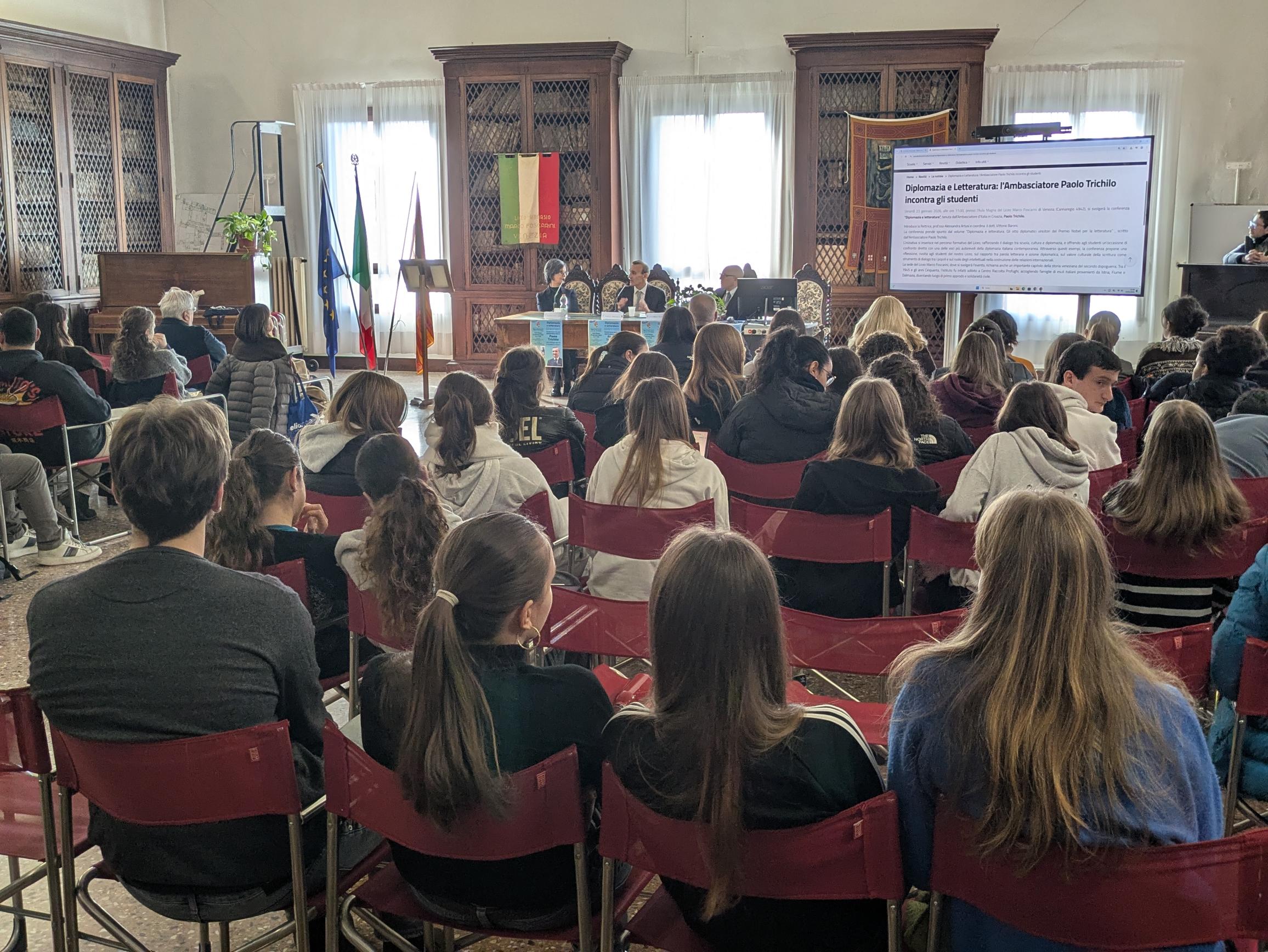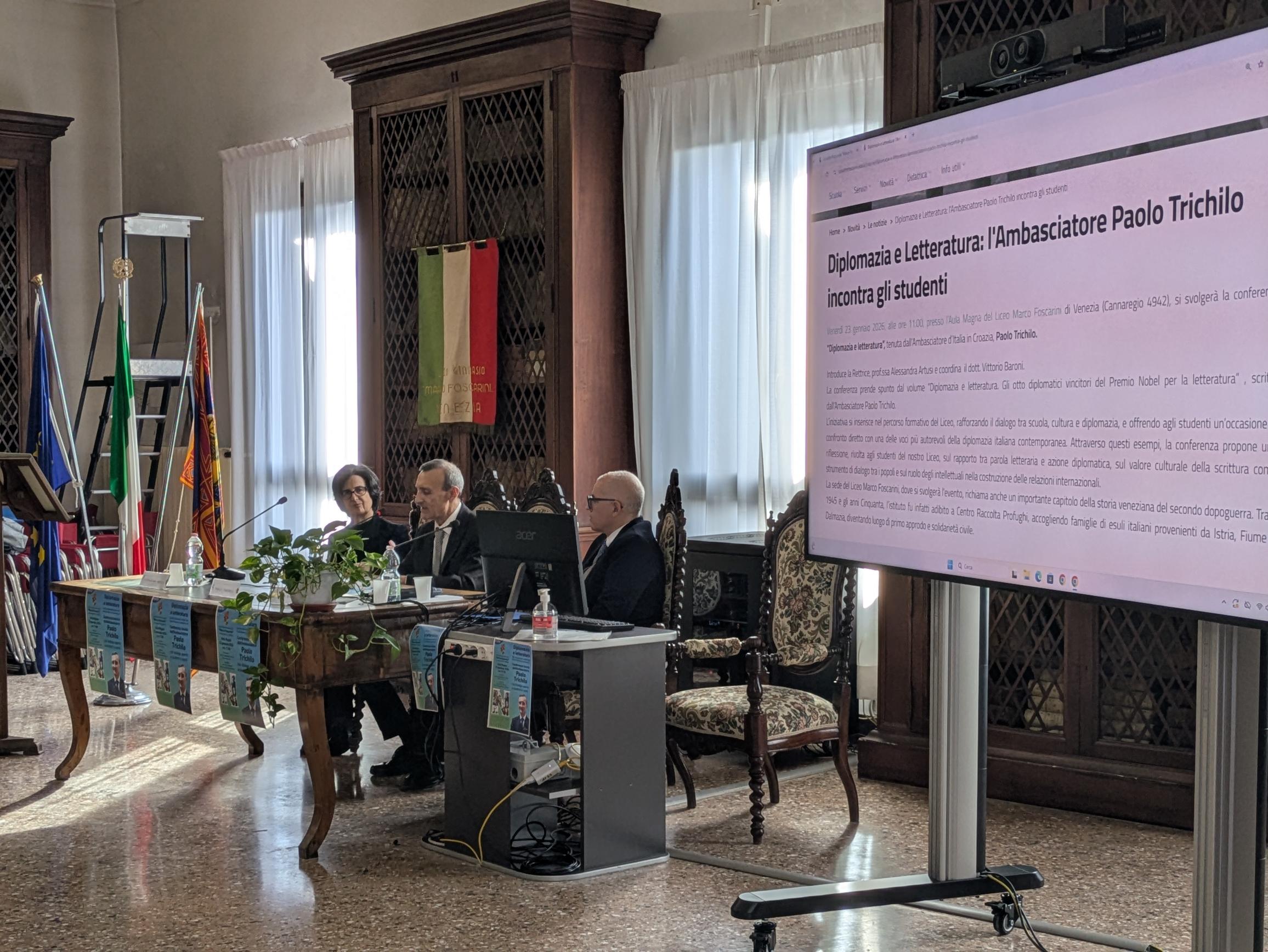 Aula magna gremita e grande attenzione degli studenti del Liceo Classico ed Europeo Marco Foscarini di Venezia per l’incontro con Paolo Trichilo Ambasciatore d’Italia in Croazia e già Ambasciatore d’Italia in Slovenia, protagonista della conferenza sul tema Diplomazia e letteratura.