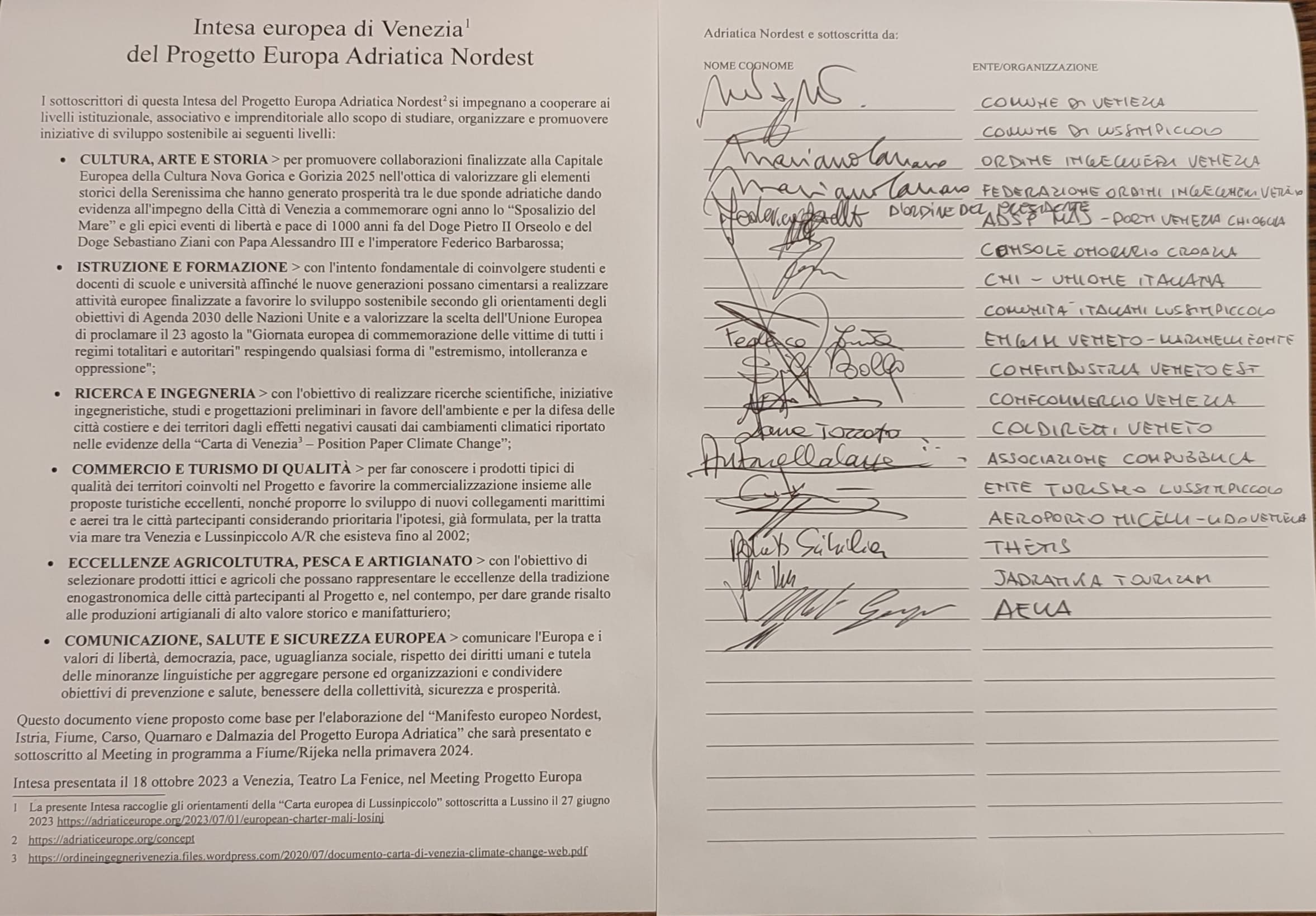 Firmata il 18 ottobre 2023 a Venezia l’Intesa Europa Adriatica Nordest che — grazie all’Unione Italiana* — rafforza i rapporti tra italiani, sloveni e croati. 18 enti e organizzazioni verso la Capitale Europea della Cultura 2025 Nova Gorica/Gorizia con gli obiettivi di sviluppo sostenibile Agenda 2030. Prossimo Meeting a Fiume/Rijeka. Il Meeting di Venezia segue quello di Lussinpiccolo dello scorso giugno. Scarica il Report in lingua italiana.