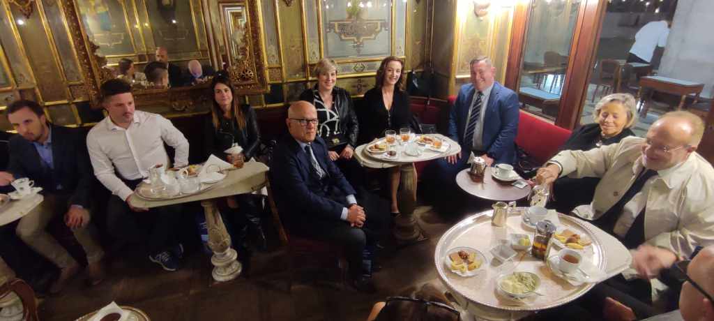 Giugno 2023, il Presidente della Comunità degli Italiani di Lussinpiccolo Sanjin Zoretić con la delegazione Ordine Ingegneri Venezia (Meeting Progetto Europa Adriatica Nordest), il Coro Vittorio Craglietto e gli attori dello spettacolo “Strenti de Scarsela”
